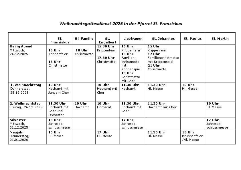 In der Pfarrei St. Franziskus und in ganz Bochum werden an den Weihnachtstagen zahlreiche Gottesdienste gefeiert. Eine Übersicht unserer Pfarrei finden Sie in der Tabelle. Eine Übersicht für Bochum und das ganze Bistum hat das Bistum Essen zusammengestellt.